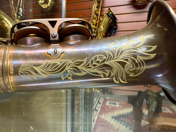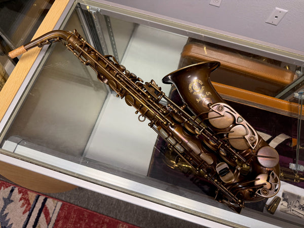 This saxophone came from a music store that shut down. The saxophone has possibly been played a short time but looks in truly mint perfect condition. The outside of the case has some light scuffs. There is some very light surface scratching however this type of brown finish sorta hides or blends used marks.