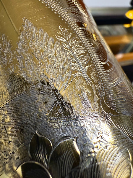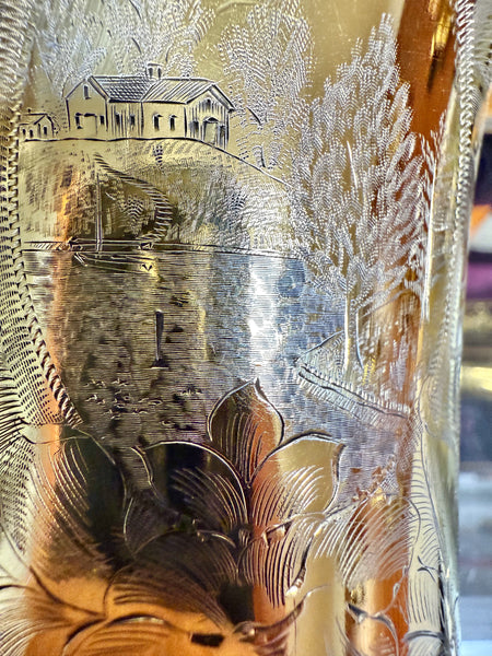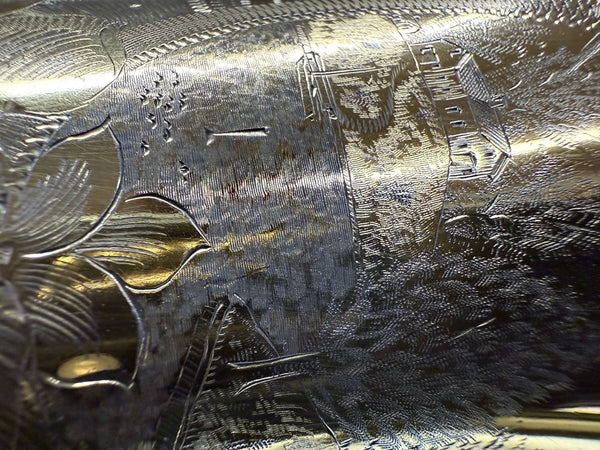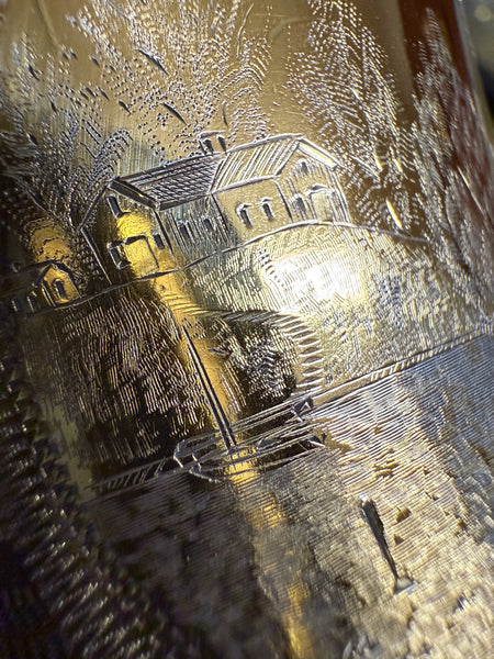 The engraving has a large amount of line work within the water, dots making up the tree leaves, etc. Overall theres a ton of what seems like advanced engraving techniques that create shading, shadows and depth to the picture.