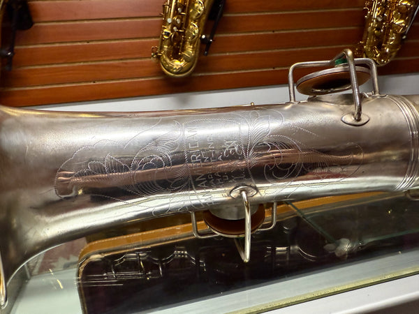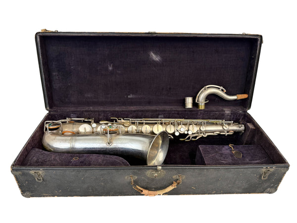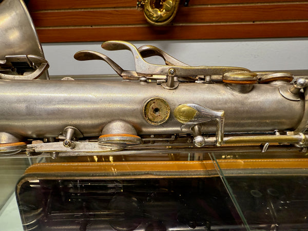 This saxophone is sold as not working and has its fair share of scratches, knicks, dings, dents, fleabites, patina, tarnish, metal wear, used marks and other various anomalies associated with such an old not working antique.
