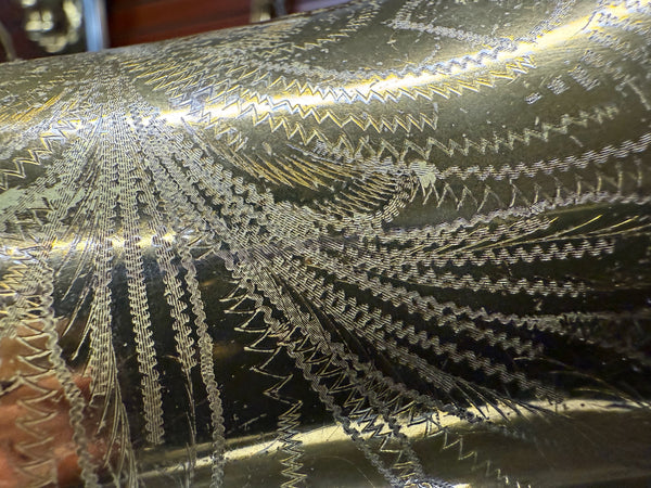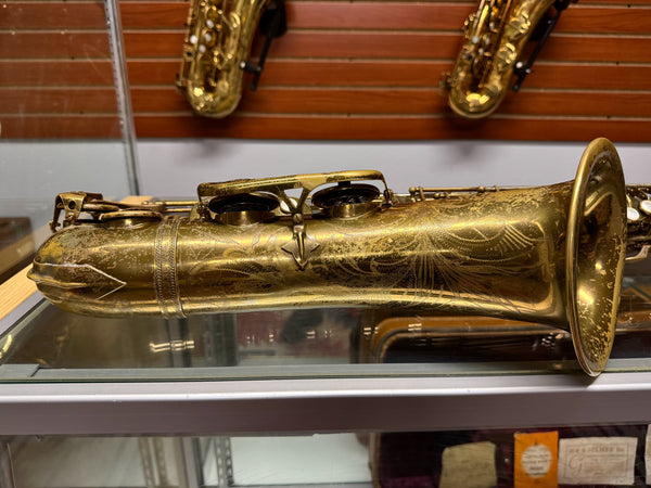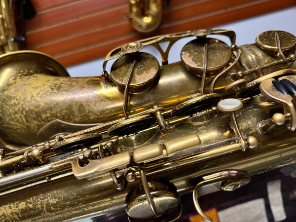 This saxophone is used and has its fair share of scratches, knicks, dings, dents, metal wear of various colors, patina, weld marks, repair marks, old pads and other anomalies associated with a not working antique.