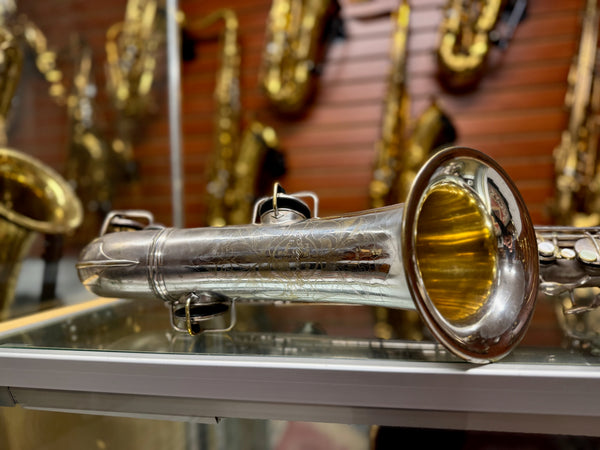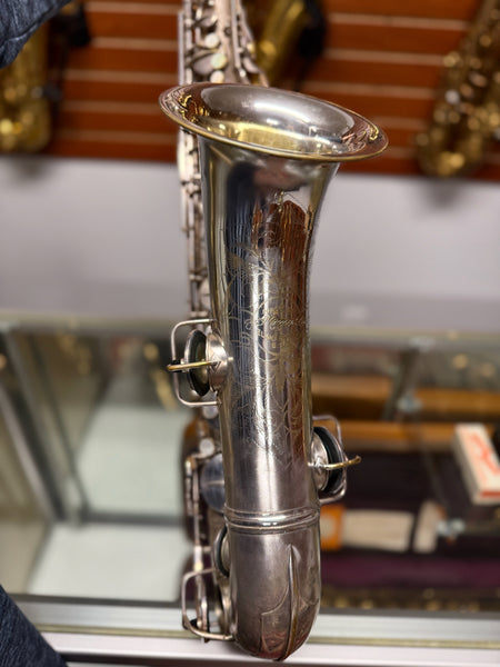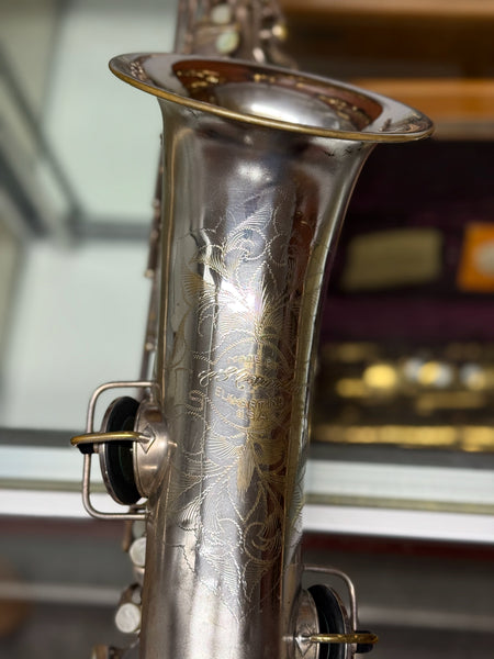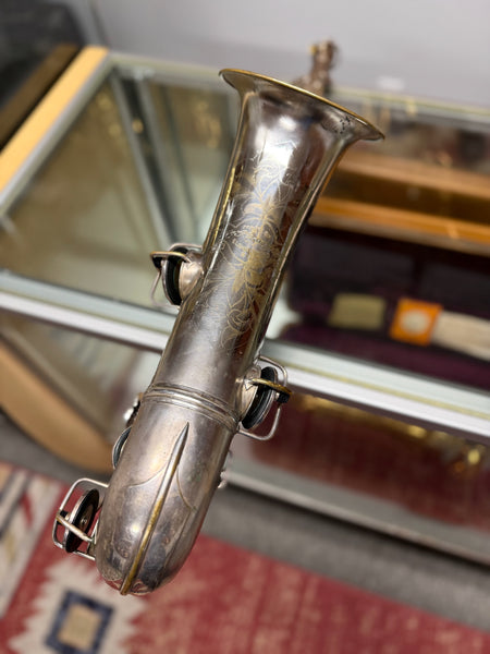 This saxophone is sold as used and has its fair share of scratches, knicks, dings, fleabites, patina silver wear, tarnish, metal wear, used marks and other various anomalies associated with such an old antique.